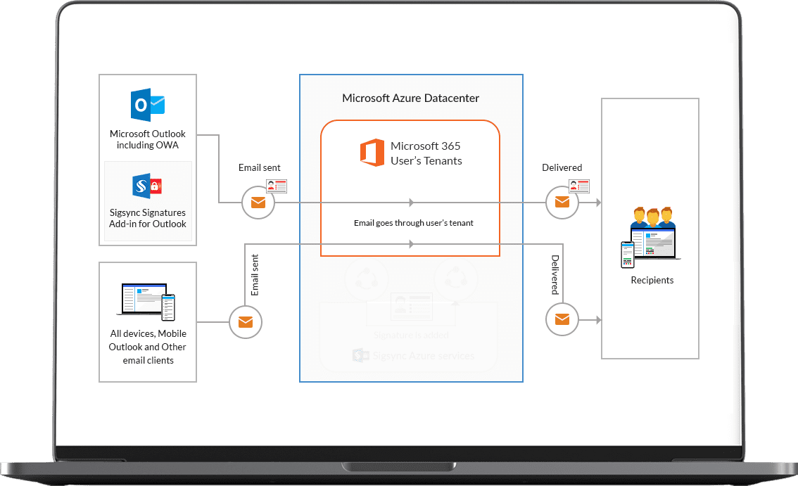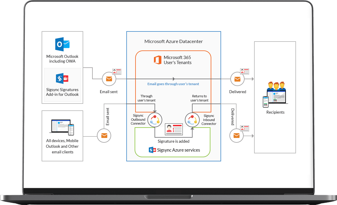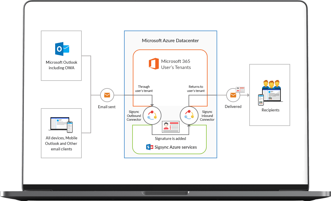 Sigsync Server Mode applies consistent email signatures and disclaimers automatically by routing emails through the secure Sigsync Azure service. Professional signatures are added to all emails, regardless of the device—desktops, laptops, mobile phones, or Macs.