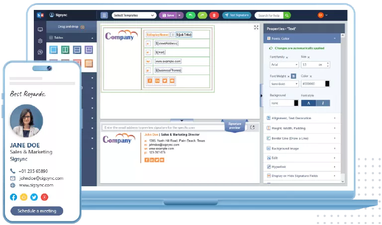 The Sigsync signature editor allows you to create email signatures that are consistent with your brand, even if you are not familiar with HTML or design software. Its intuitive interface makes it easy to change signature properties, preview and update your signature in just a few clicks.