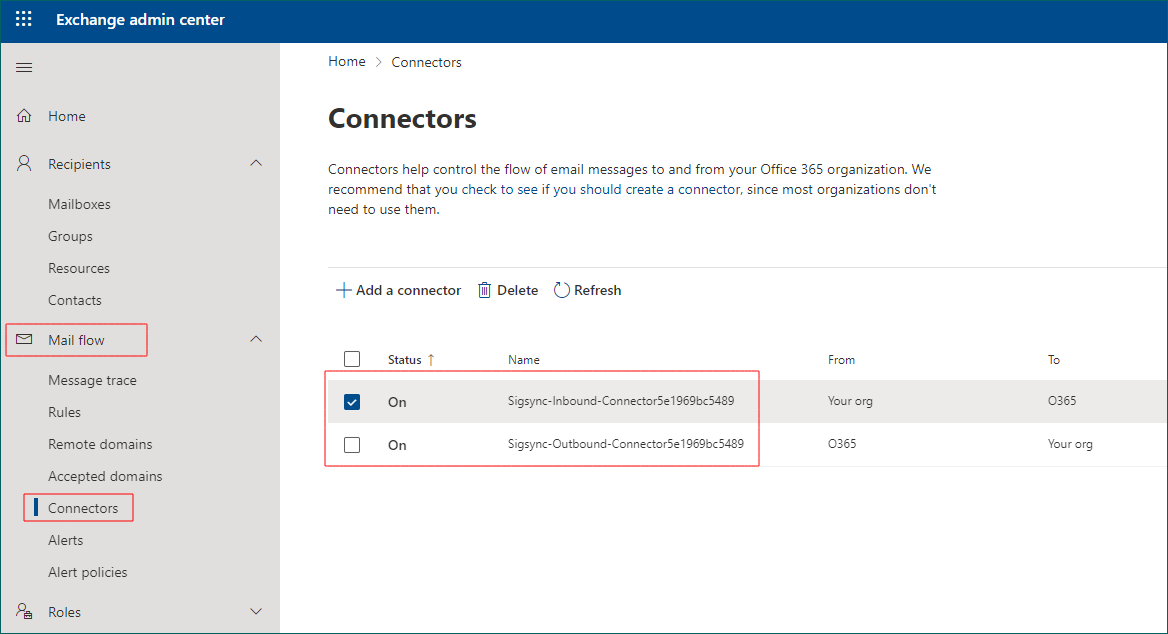 How to reconfigure in Sigsync if I have accidentally deleted Exchange online connectors or rules on Office 365 Exchange admin center?