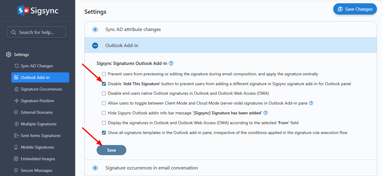The 'Add This Signature' button in the Sigsync signature add-in for Outlook is currently disabled. How can I enable it?
