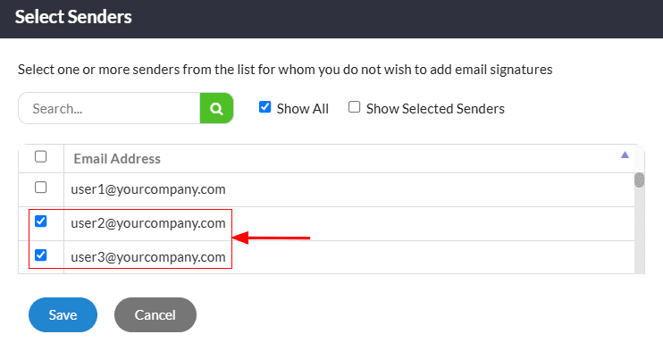 How do I exclude a few users from attaching signatures?