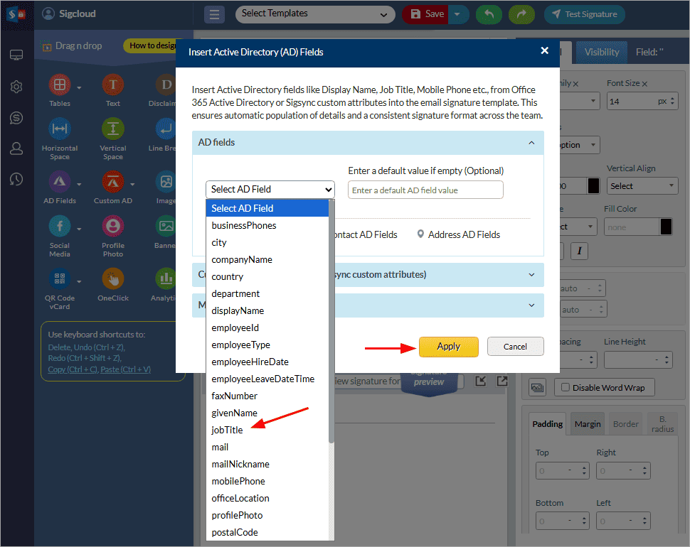 How to include Active Directory fields like Company Name, Title, Address, Phone etc., in my signature template?