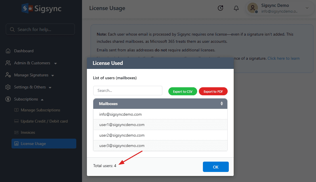 Why is the license usage page under Sigsync 'Dashboard' not displaying all the licenses count that I have purchased?