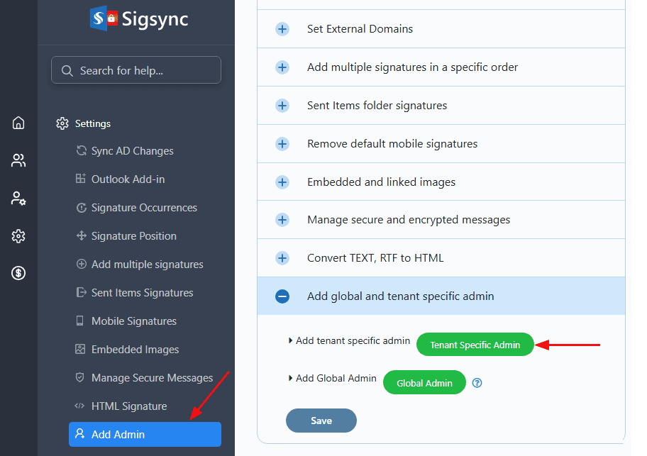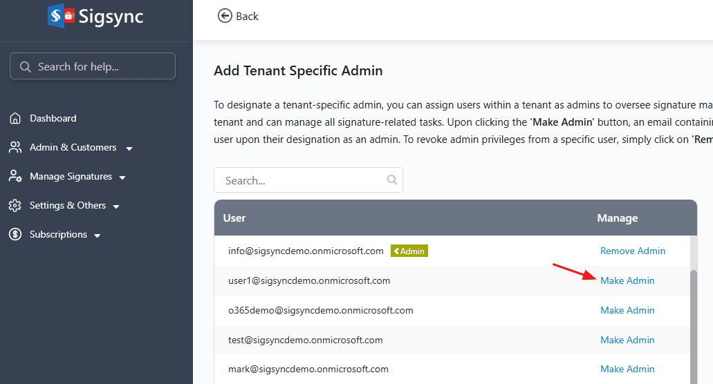 You can add users of a tenant as an Admin to that tenant to manage their signatures. Upon making any tenant user as Admin, the particular user (Admin) will have access to the tenant they belong to and can manage all the Signature related operations. The user will receive an email with login instructions and information about managing tenant signatures. By clicking on Remove Admin, you can remove the Admin privileges from a specific user.