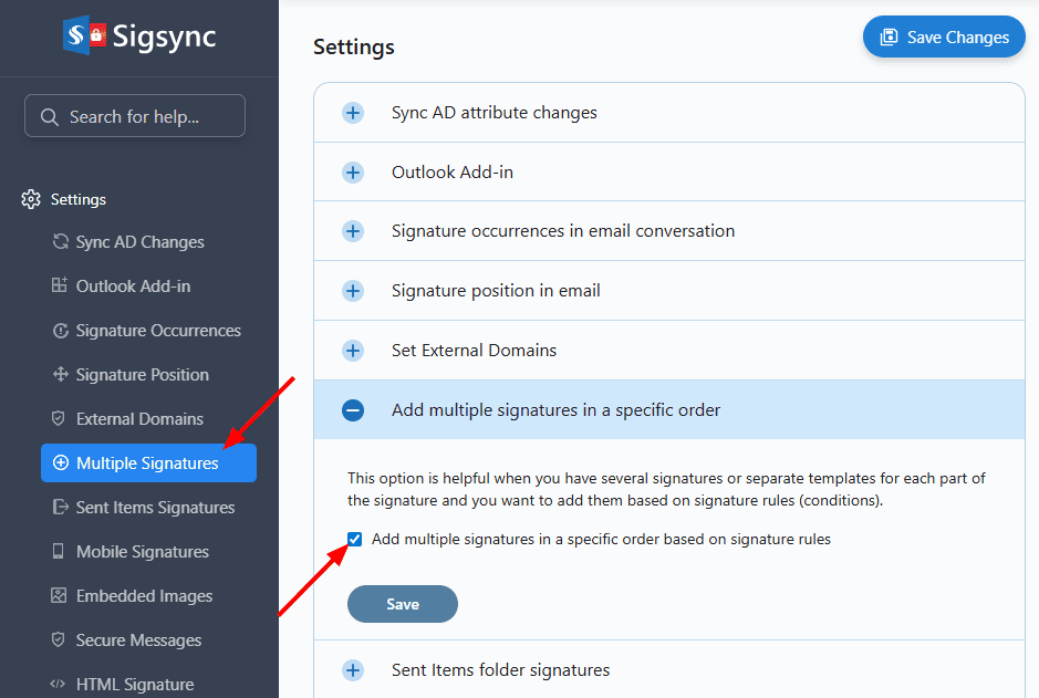 - Click the ‘Multiple Signatures’ tab, select ‘Add multiple signatures in a specific order based on signature rules’, and then click ‘Save’ to apply the changes.