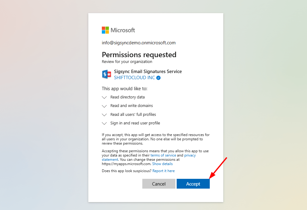 - Accept the required permissions for the Sigsync Office 365 Email Signature Service to access user details and add it to email signatures. Only a Global Admin account in Microsoft 365 can grant these permissions.