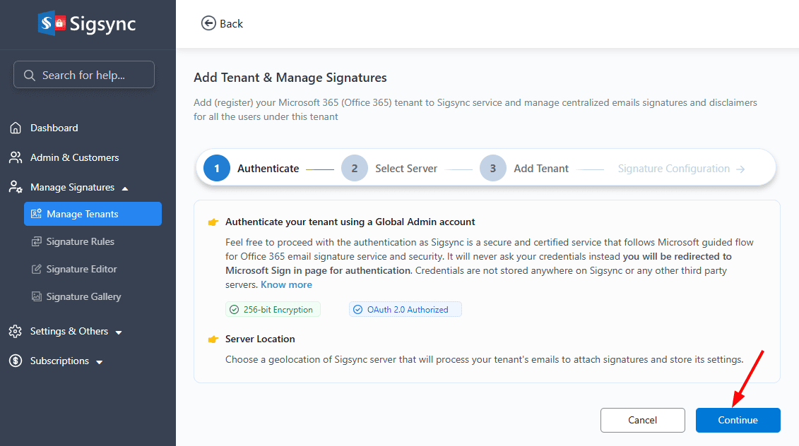 Now the Tenant is added successfully. Click the ‘Continue’ button to proceed with the signature configuration.
