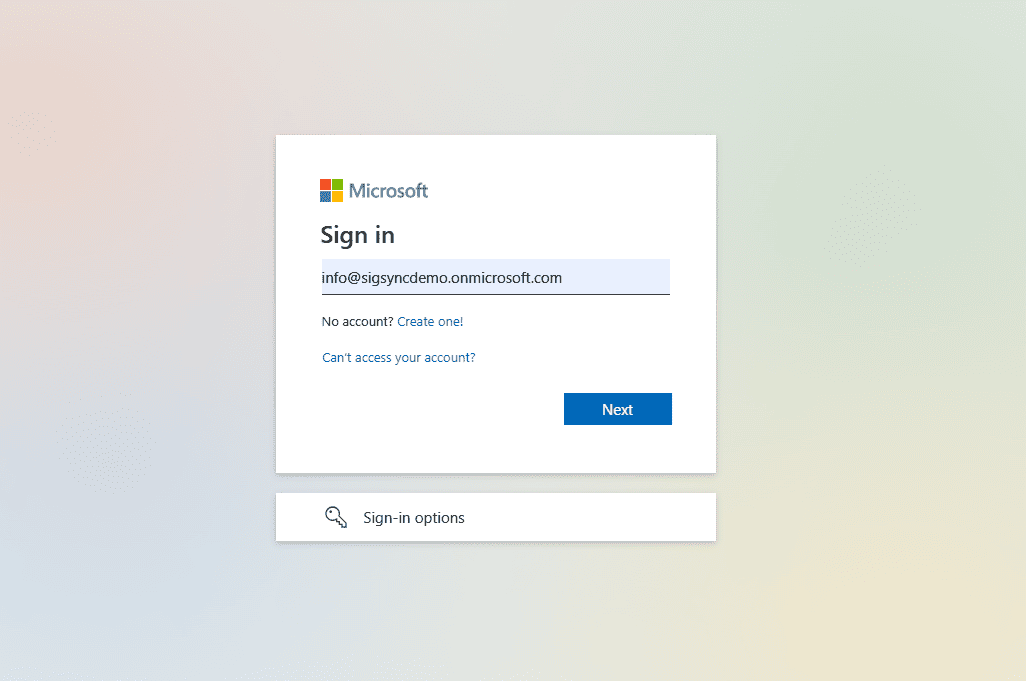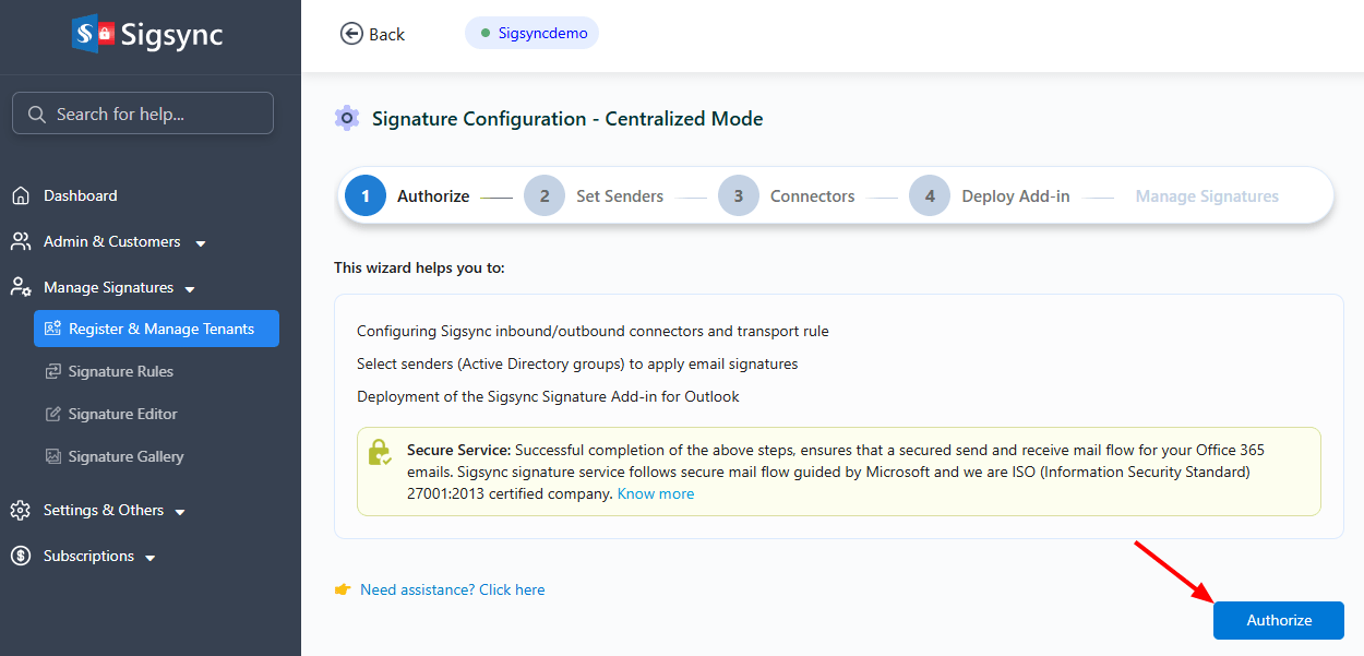 - Sigsync is a secure service that follows Microsoft’s recommended flow for Office 365 email signatures and security. It uses Azure OAuth 2.0 authentication to connect with your Office 365 tenant through Microsoft’s official sign-in process. A one-time authentication using a Global Admin account is mandatory to proceed.