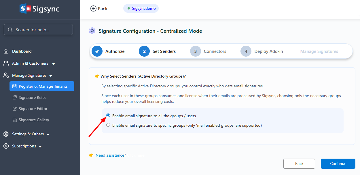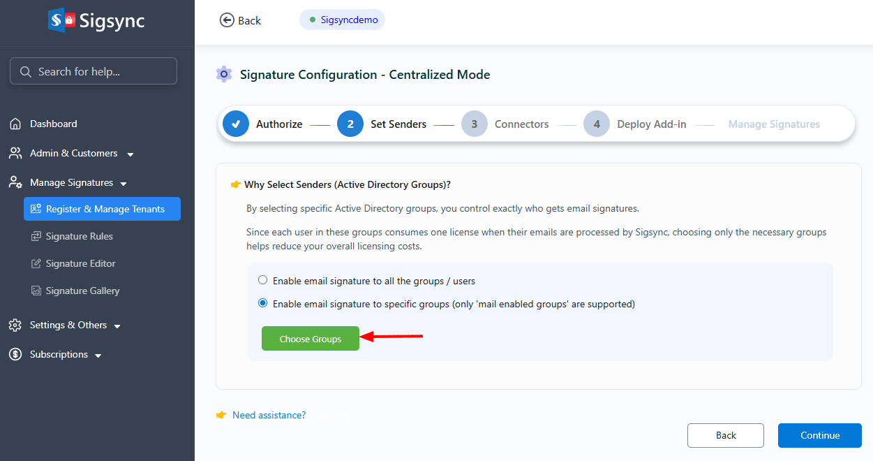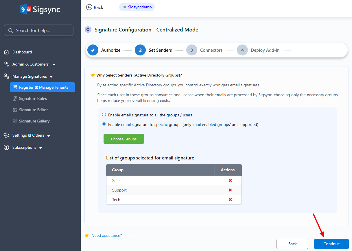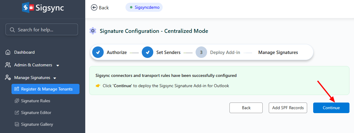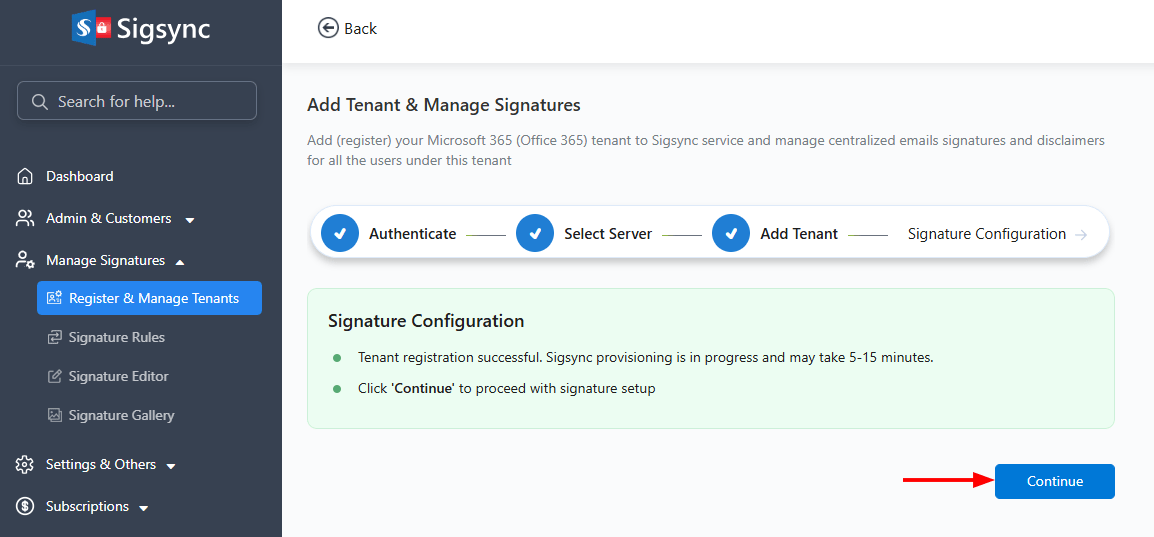 - Now the Tenant is added successfully. Click the ‘Continue’ button to proceed with the signature configuration