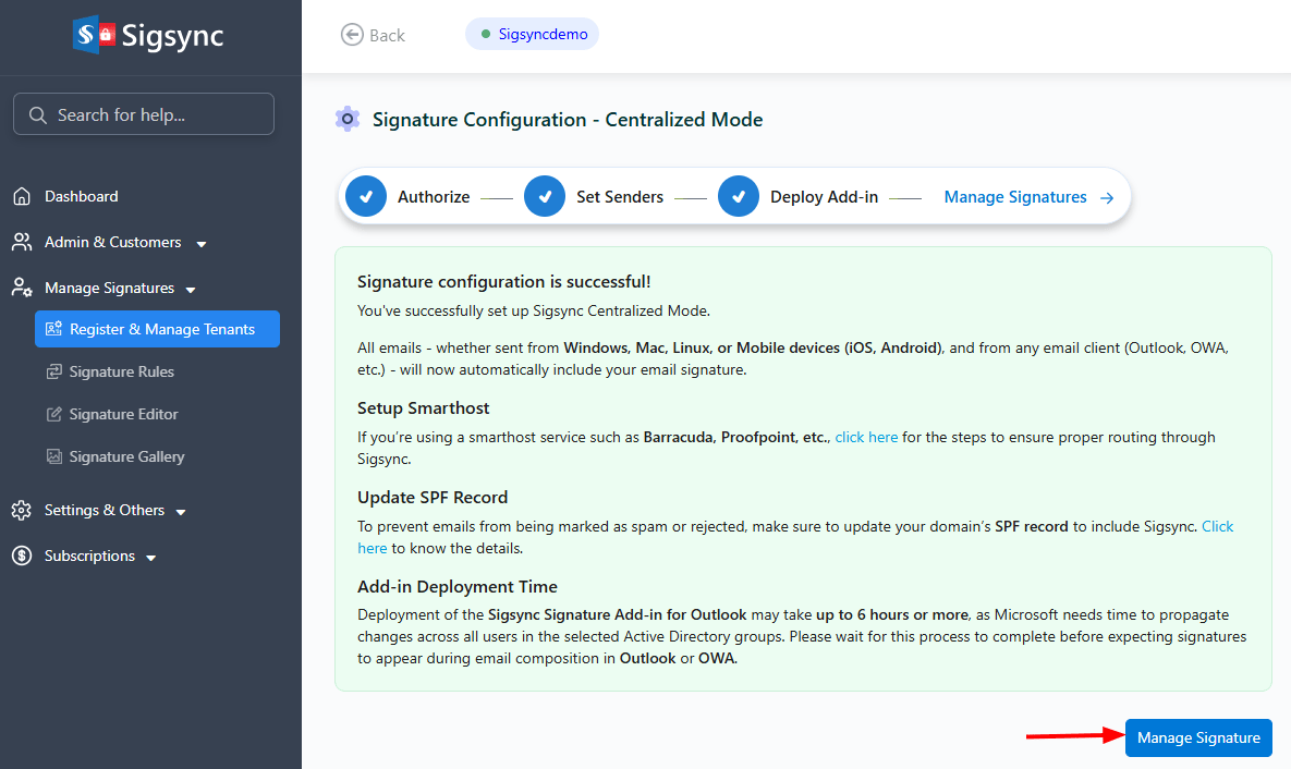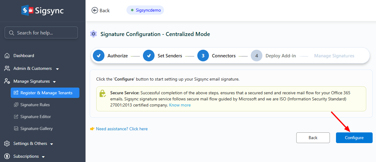 - Click the ‘Configure’ button to proceed with the Sigsync signature configuration