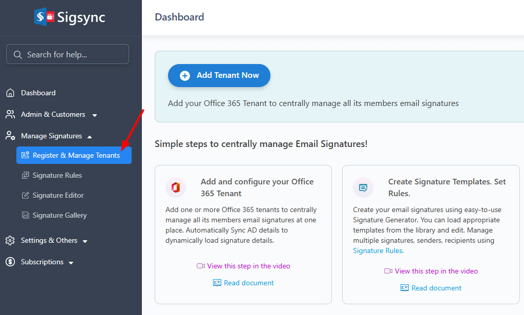 - Navigate to ‘Manage Signatures’ > ‘Register & Manage Tenants’ tabs