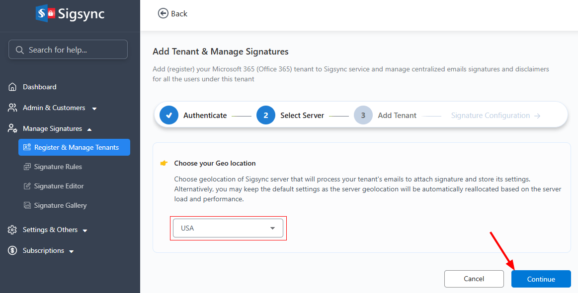 Note: Choose your region carefully, as it cannot be changed later without deregistering your tenant, which will also cancel your subscription. If you ever need to switch regions, reach out to Sigsync support.