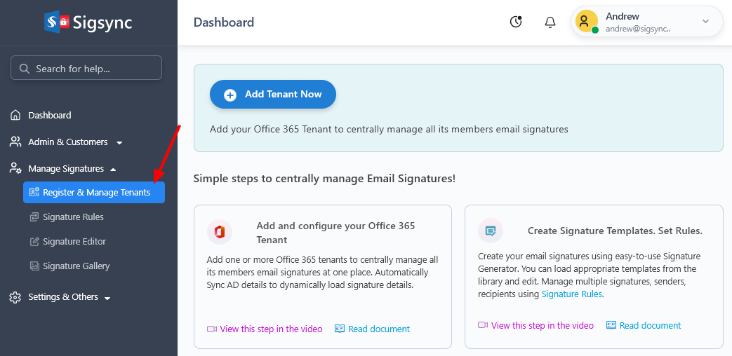 Step 2: Select 'Manage Signatures' > 'Register & Manage Tenants' tab from the dashboard.
