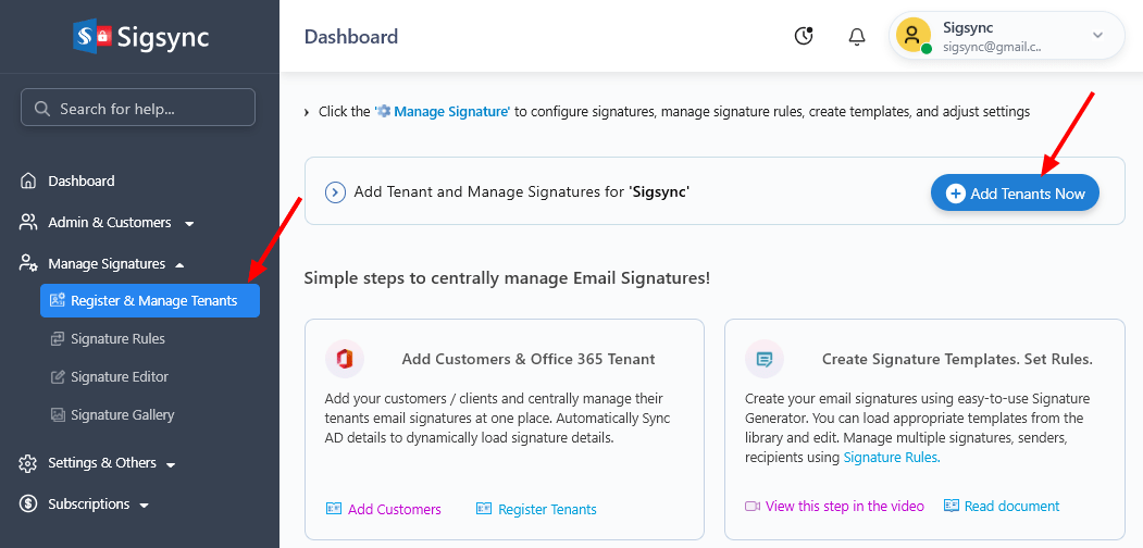 Step 2: Select 'Manage Signatures' > 'Register & Manage Tenants' tab from the dashboard. Click 'Add Tenants Now' button.