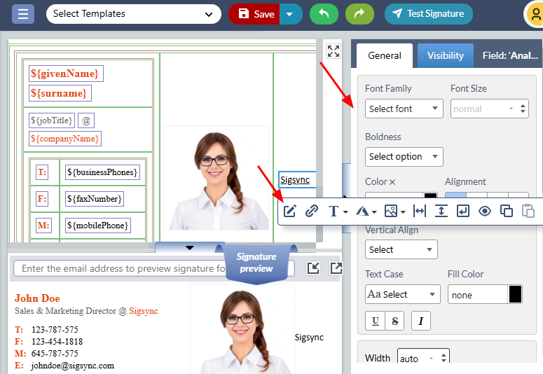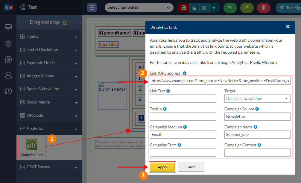 To personalize the properties of an Analytic Link, click the Analytic Link field in the design pane, then set the necessary properties under the 'General' tab on the right-hand side of the signature editor. You can further customize the link by clicking the ‘Edit’ icon.