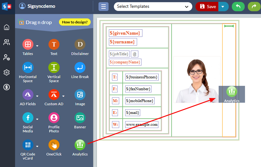 Adding an analytic link in your email signature is just a drag and drop process of the ‘Analytics Link’ component in Sigsync editor.
