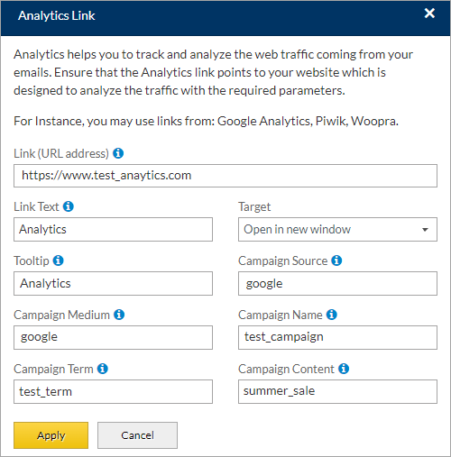 As you fill in these fields, the URL will update automatically with the tracking information. Next, click the ‘Apply’ button.
