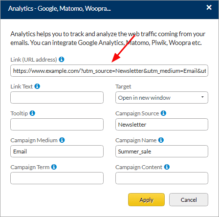 As you fill in these fields, the URL will update automatically with the tracking information. Next, click the ‘Apply’ button.