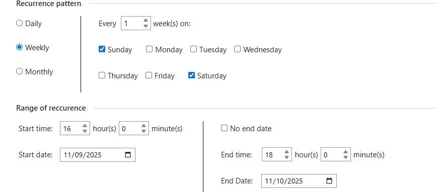 For example, we are using a weekly pattern for this demonstration. This will be our weekend out of office signature. As you can see in the image below, we have selected Saturday, Sunday in the Weekly section and the time set is from 4PM to 6PM from 11 September 2025 to 11 October 2025.