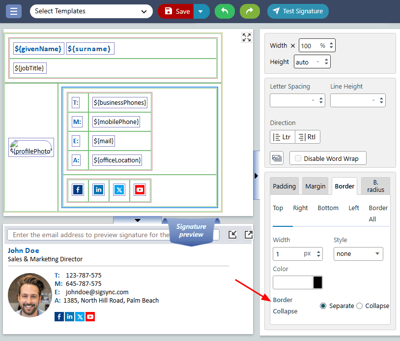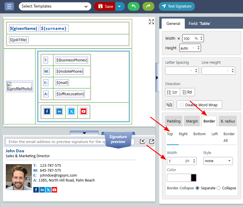 The border (line separator) is an essential property for the signature fields, particularly in ensuring that the different sections of a signature are well-defined and visually organized. By utilizing this property, you can create a clear separation between the contact information, social media links, or other signature elements, making it easy for the recipient to read and understand the contents.