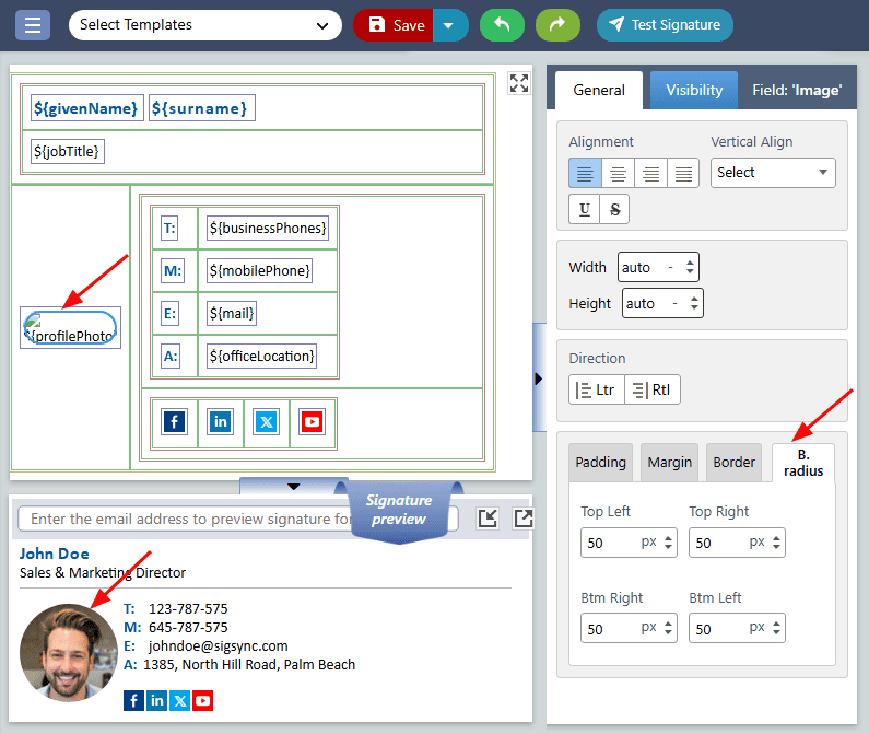 The ‘Border Radius’ property controls the rounding of the corners of the signature elements. This property is especially useful when dealing with images or logos that have sharp corners, as it can help soften the edges and create a more cohesive appearance. The border radius property is easy to use and can be adjusted to fit the design of your signature, giving you full control over its appearance. The use of rounded images is a great alternative to using the border radius property in Outlook, as some versions of Outlook do not support the border radius property.
