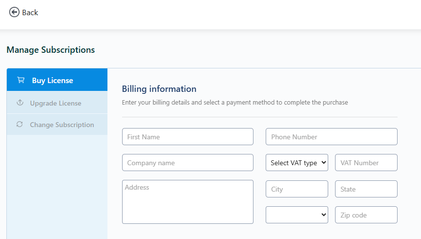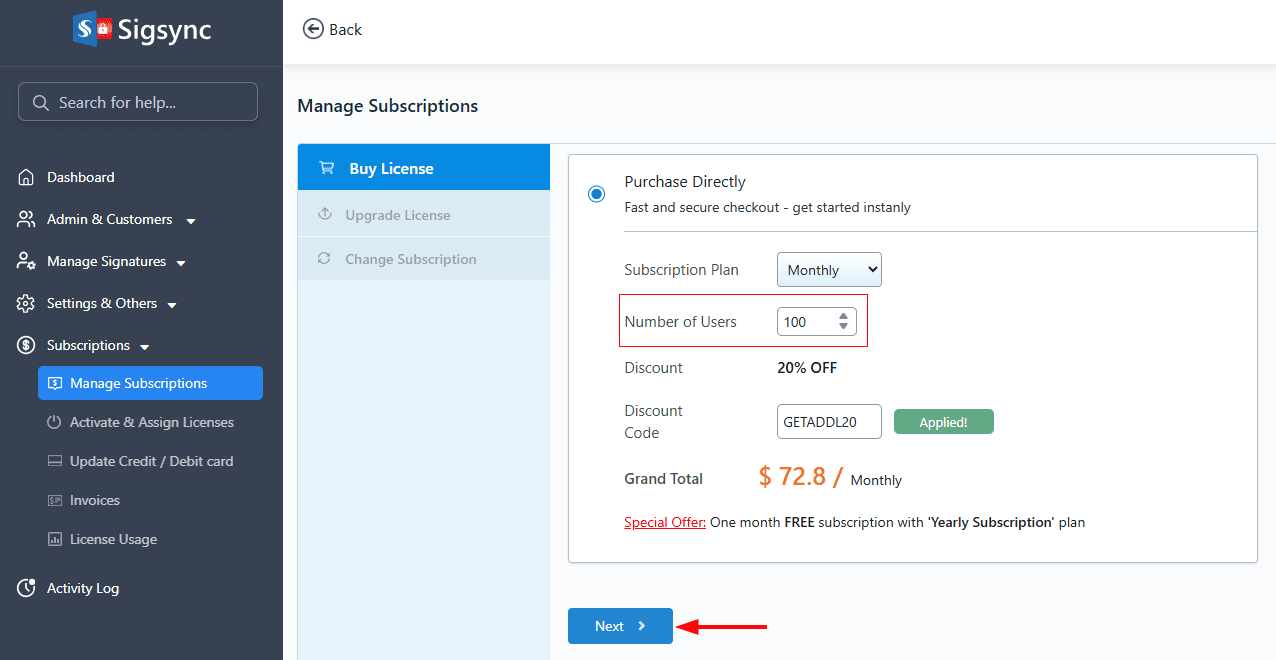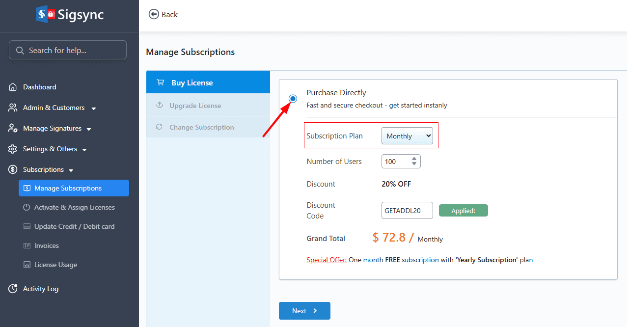 - Select the ‘Purchase Directly’ option and choose the appropriate ‘Subscription Plan (Monthly or Yearly)’.