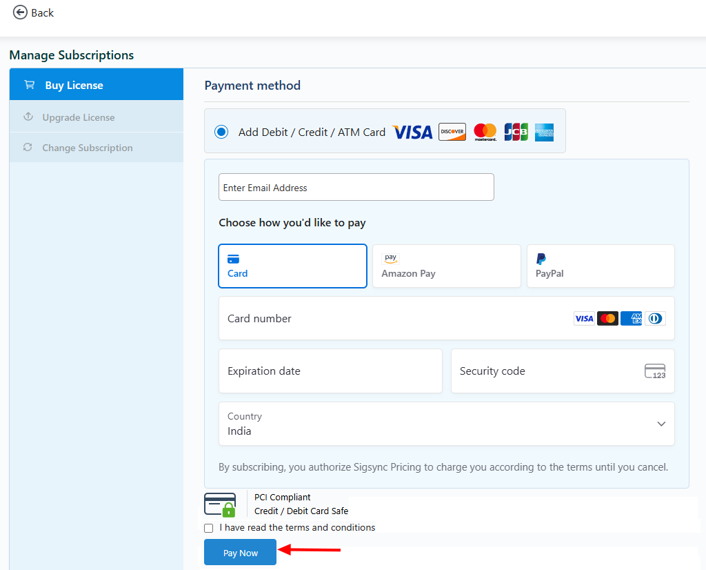 - Upon clicking the ‘Pay Now’ button, the payment will be processed. Subscription details along with the next billing date will be shown in the ‘Subscription Details’ page.