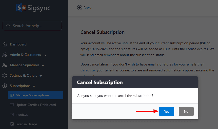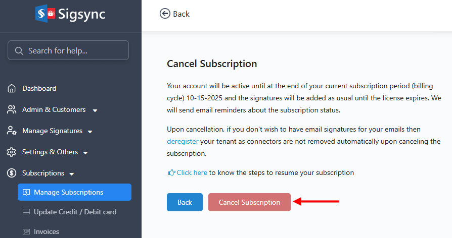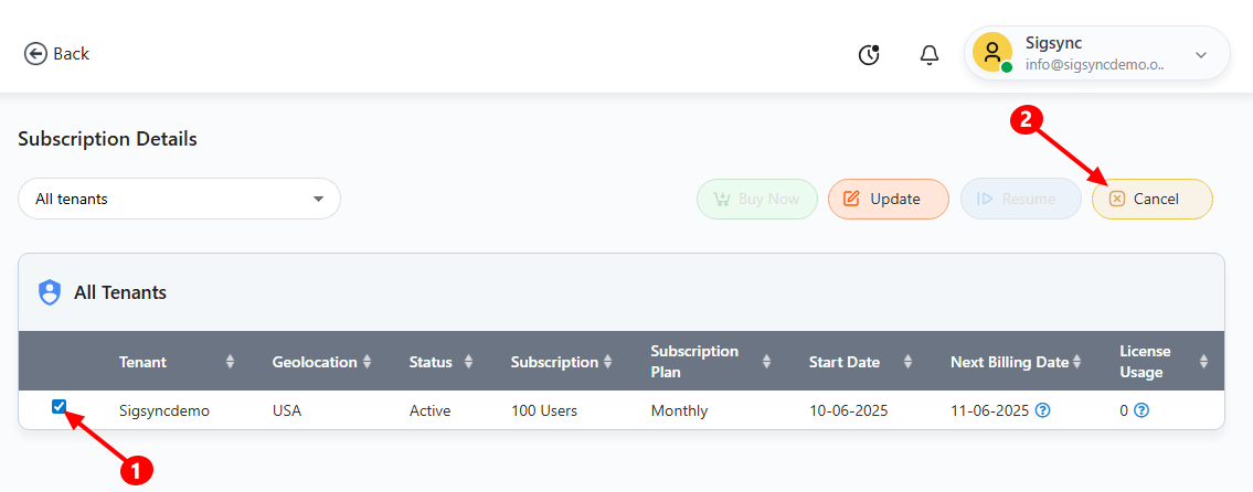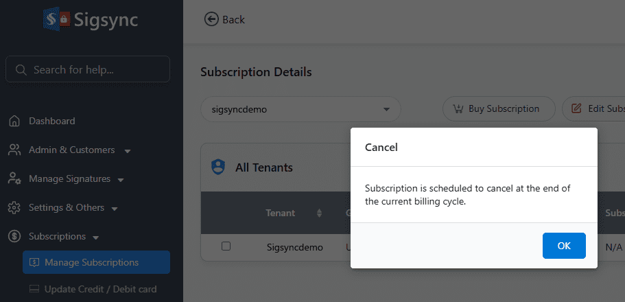 Note: If you deregister any tenant from Sigsync, the tenant's subscription will be canceled automatically.