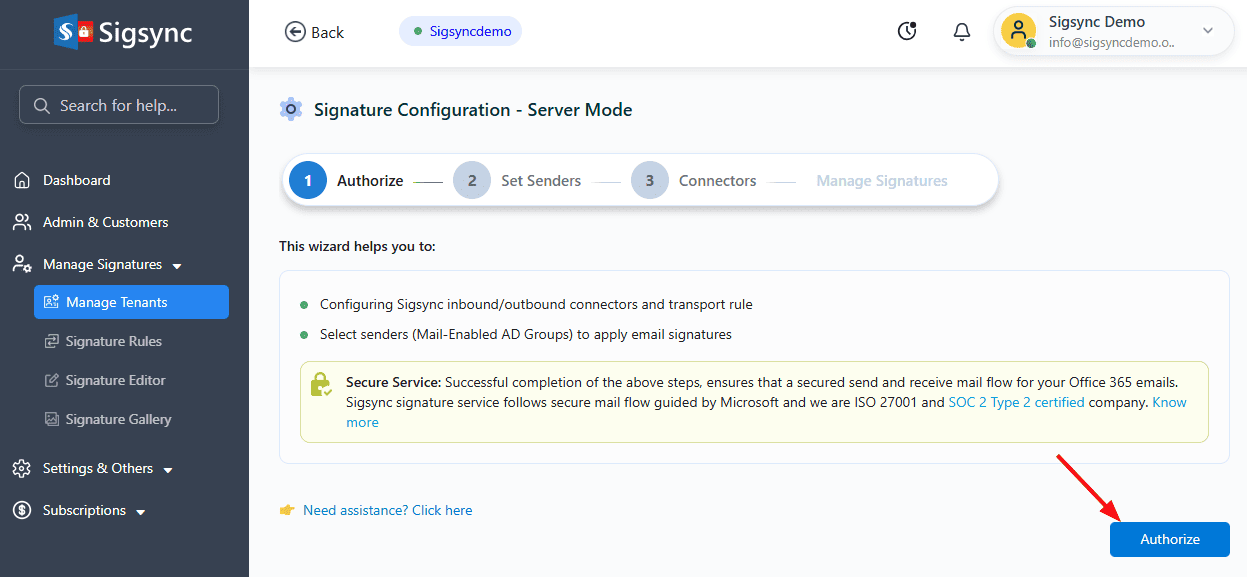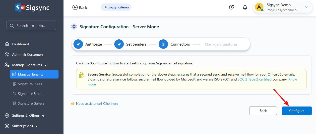 - Click the ‘Configure’ button to proceed with the Sigsync signature configuration.