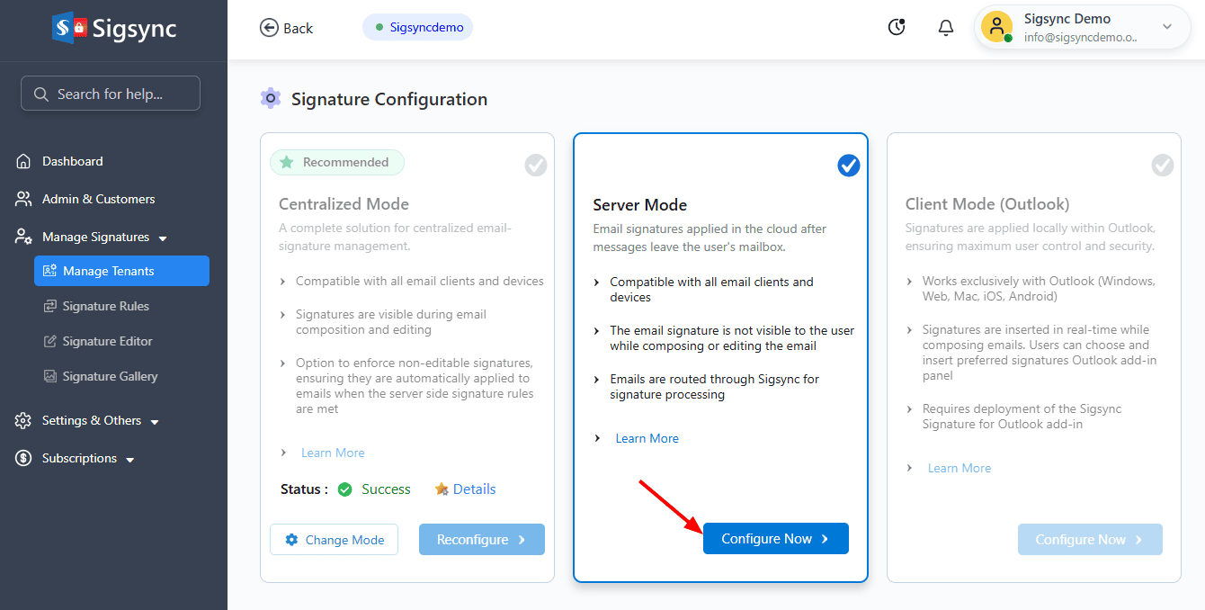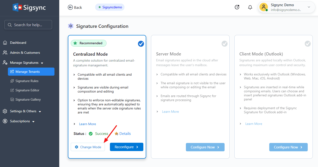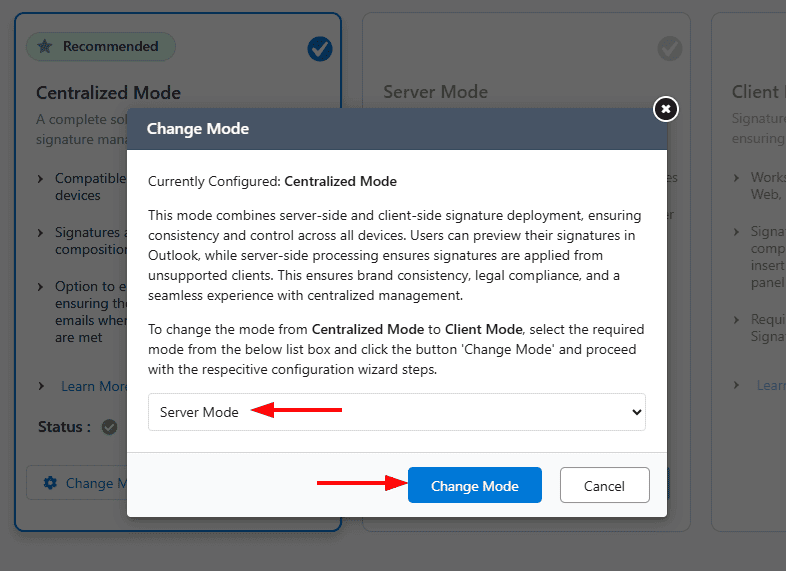 - Click on ‘Change Mode’ to switch between Centralized and Server Side signature modes.