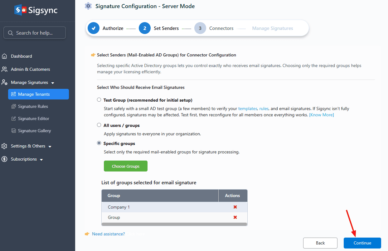 - The selected AD groups will be displayed. To remove a group from the list, click the ‘x’ icon in its corresponding row. Click ‘Continue’.