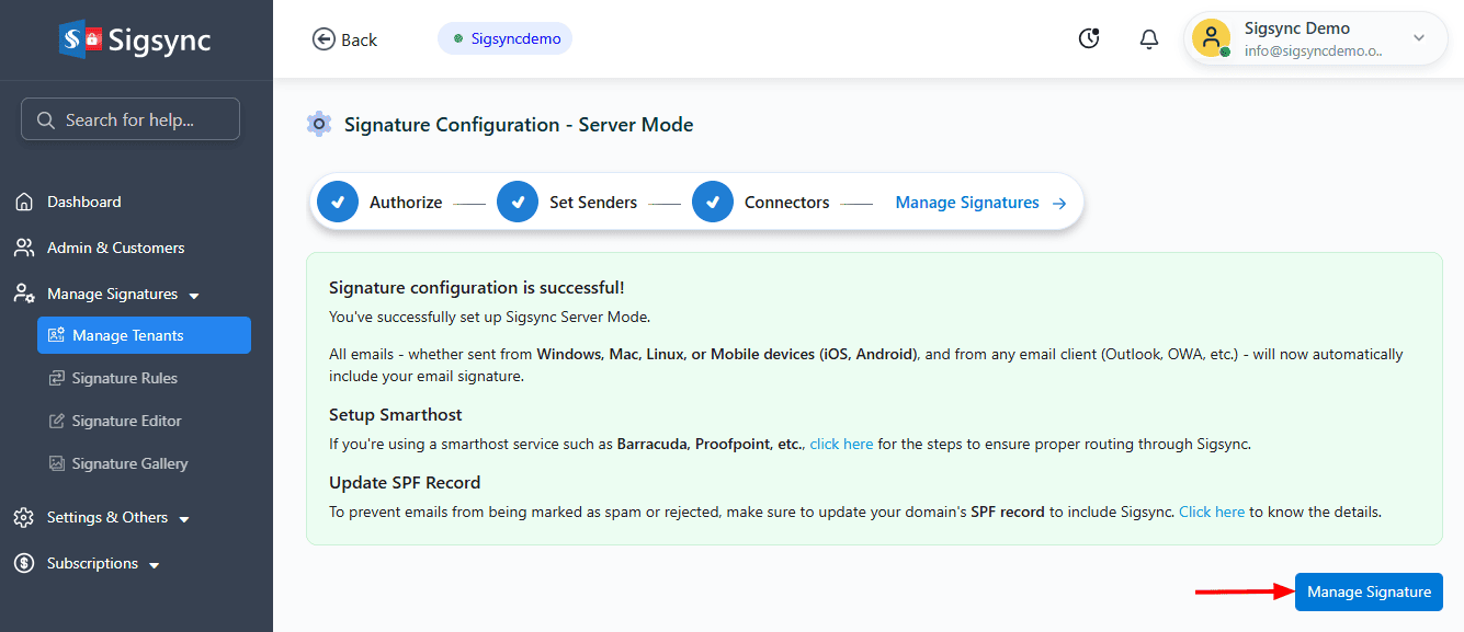 - The server-side configuration is now complete, and you can start creating and managing your email signature templates.