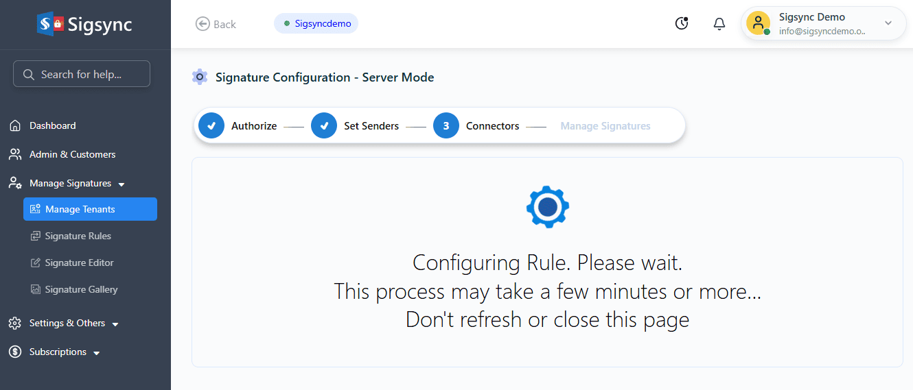 - The signature configuration takes a couple of minutes to complete.