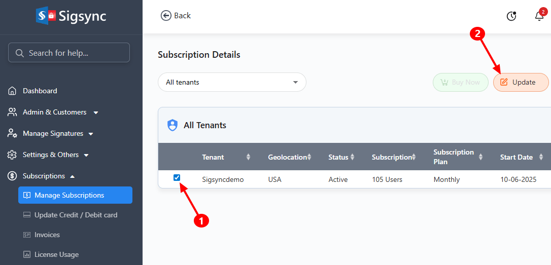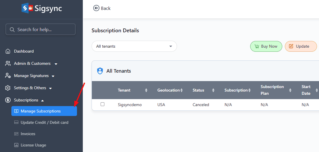 - On the Subscription Details page, select the Tenant for which you want to change the payment method, and click 'Update'.