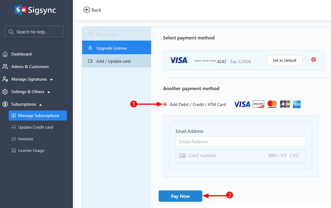 - Under the ‘Another Payment Method’ section, select ‘Add Debit / Credit / ATM Card’ and enter the card details. Click the ‘Pay Now’ Button.