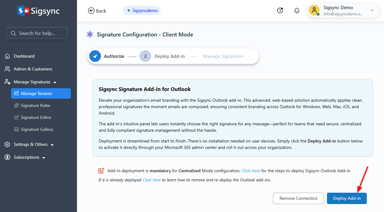 Sigsync Signatures for Office 365 provides a flexible and scalable signature management system designed to support different organizational workflows. Sigsync includes three signature deployment modes Centralized Mode, Server Mode, and Client-Side (Outlook) Mode. Centralized Mode is the recommended option for most organizations, as it combines both server-side processing and Outlook add-in–based client-side signatures, offering the most complete and reliable signature experience.