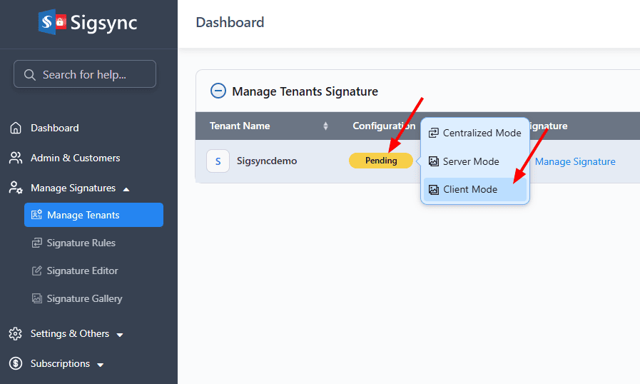 - Navigate to the ‘Manage Signatures’ > ‘Manage Tenants’ tab.