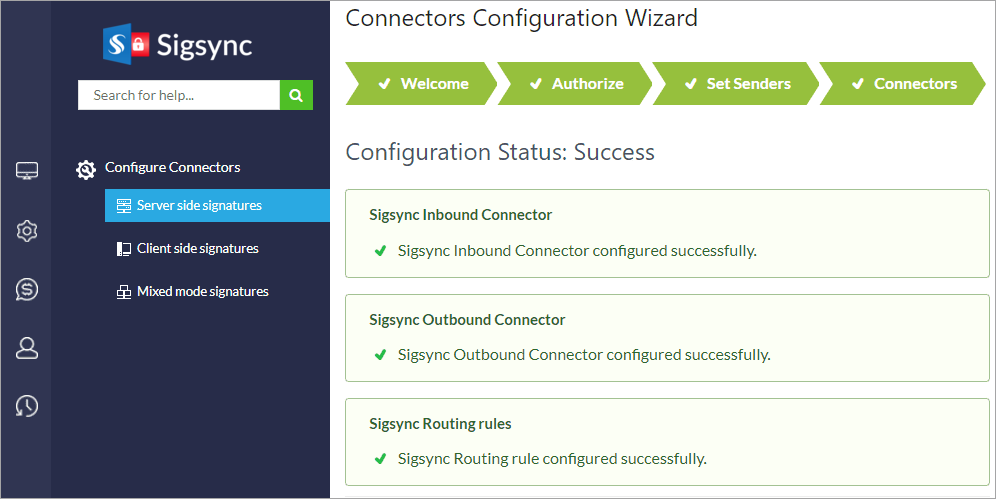 Once this is done, the Server Mode configuration is complete. Signatures will be applied in Server Mode, meaning they are added after the email is sent from your Outlook client. To have signatures appear automatically while composing emails in Outlook, proceed with the Sigsync Signatures Outlook Add-in deployment.