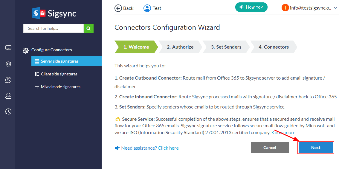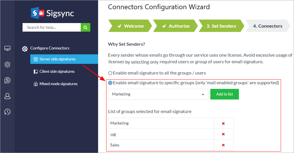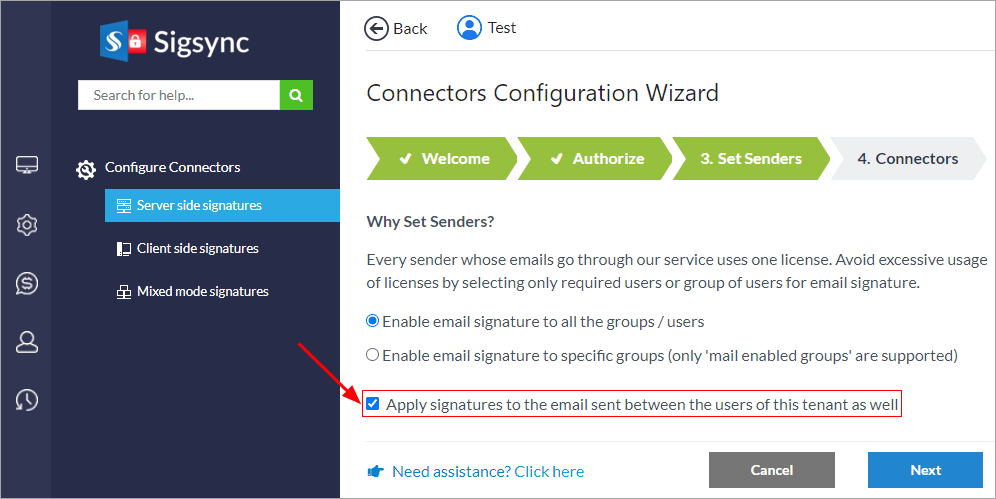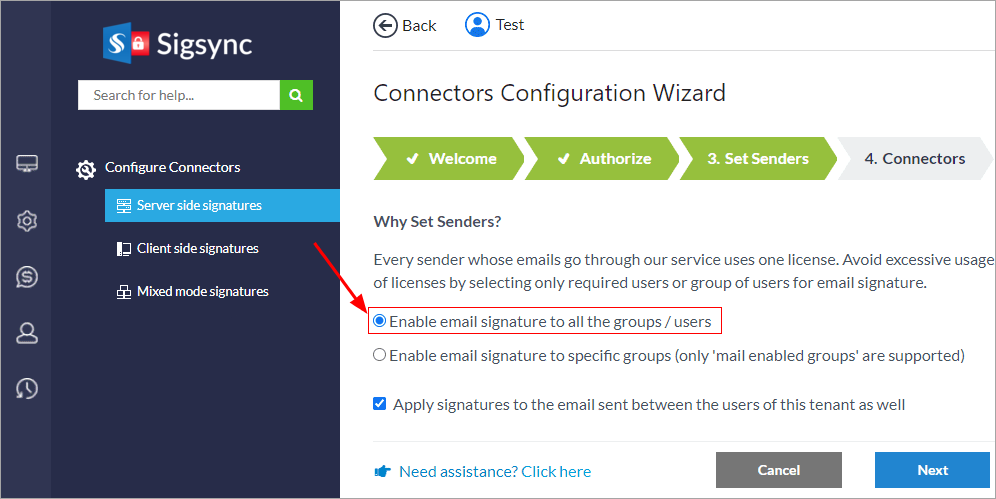 If you have registered your tenant in Sigsync and the signature configuration is still pending, follow the steps below to set up the Centralized Mode (Recommended Mode) signature. Sigsync allows you to first apply signatures to a Test Group of users to verify templates, rules, and formatting. Once everything is confirmed, signatures can be deployed to specific groups such as departments or teams, or rolled out organization-wide to ensure consistent branding.