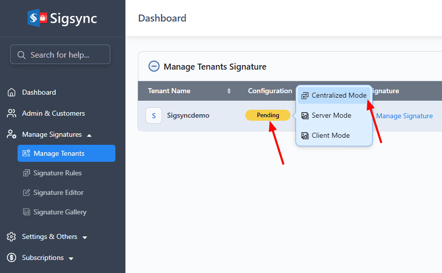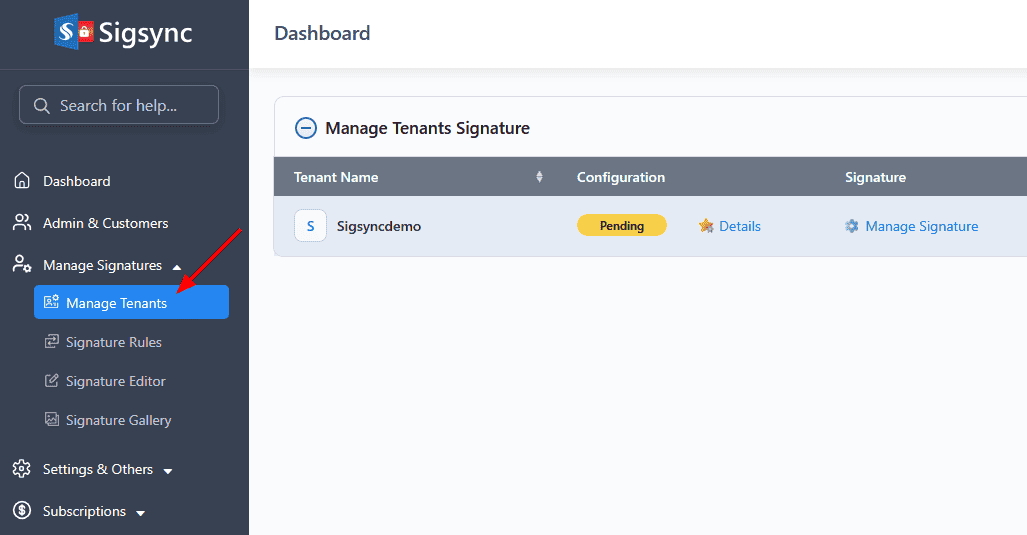 - Login to the Sigsync Dashboard and navigate to the ‘Manage Signatures’ > ‘Manage Tenants’ tab.