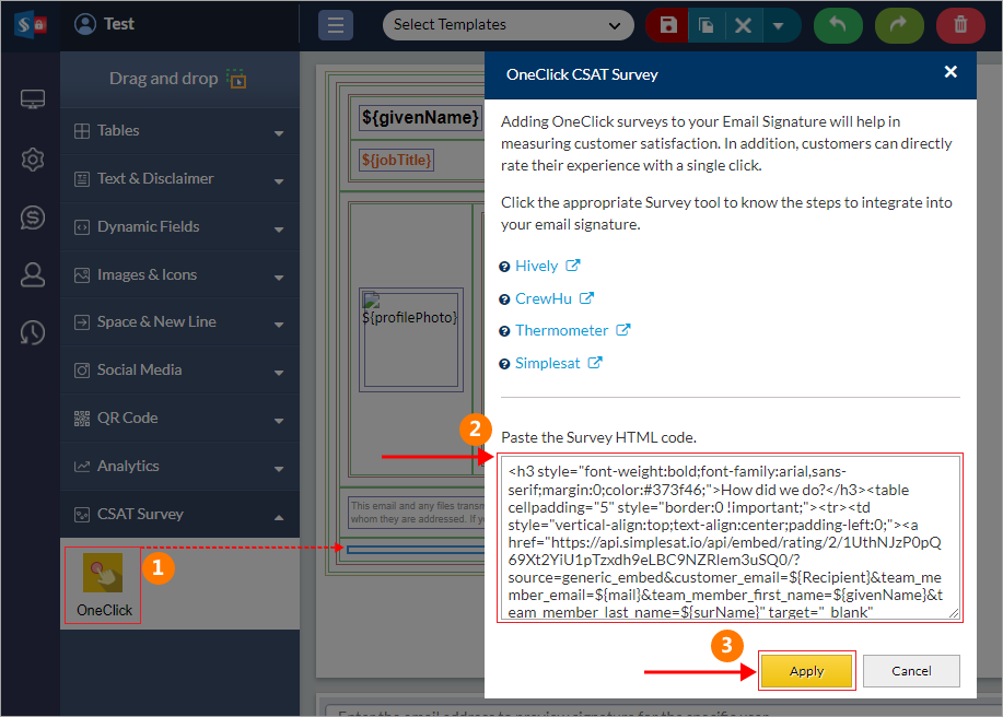 To insert an OneClick Survey in your email signature using Sigsync, follow these steps: