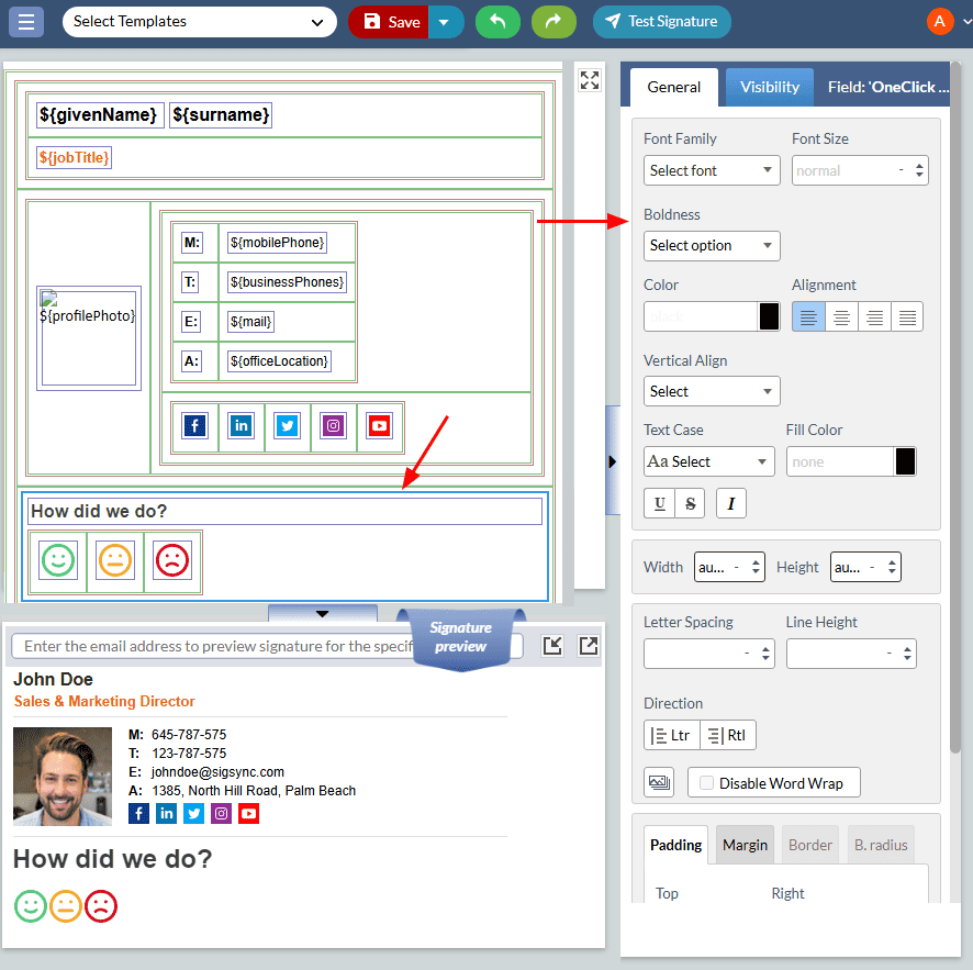 To customize the properties of the OneClick component, simply click on the corresponding field in the design pane. Then, adjust the necessary properties using the ‘General’ tab located on the right-hand side of the signature editor.