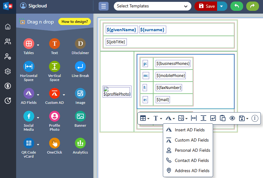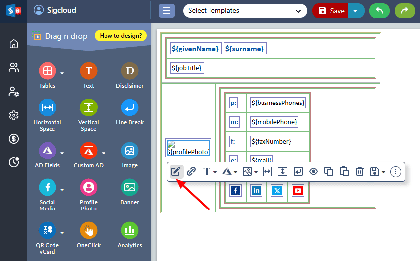 You can edit each and every components added in Signature template by selecting respective component and Edit field will appear as shown below: