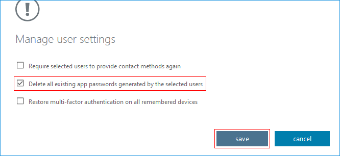Step 6: Select 'Delete all existing app passwords generated by the selected users' and click 'save' as shown below.