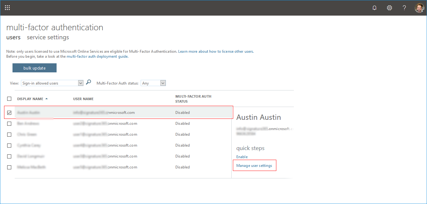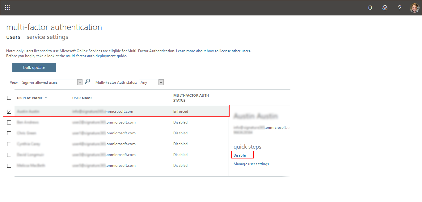 Step 3: Select the user for which you want to disable the MFA, Click the link 'Disable' as shown below.