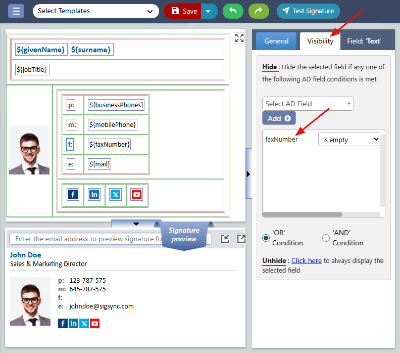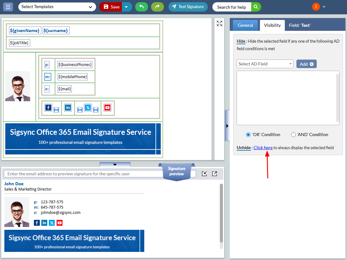 Sigsync offers a unique feature to help you maintain a complete and consistent email signature. Within the signature editor, you'll find the 'Visibility' property tab, which lets you remove any empty fields that may show up in your signature when the corresponding field details are unavailable in your Office 365 Azure Active Directory.