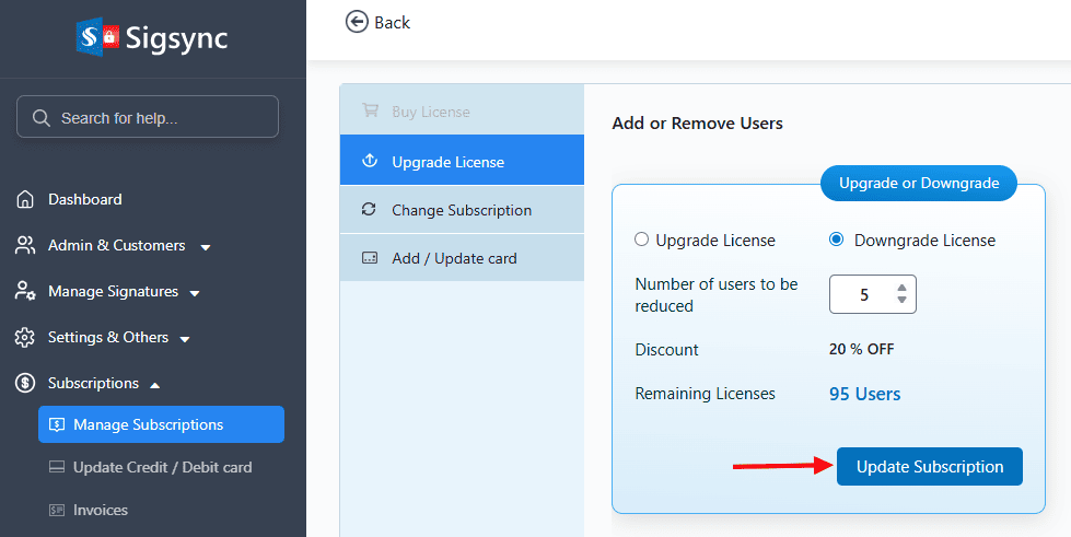 - Click the ‘Update Subscription’ buttonThe downgraded licenses will be effective from the next billing cycle.