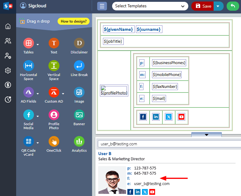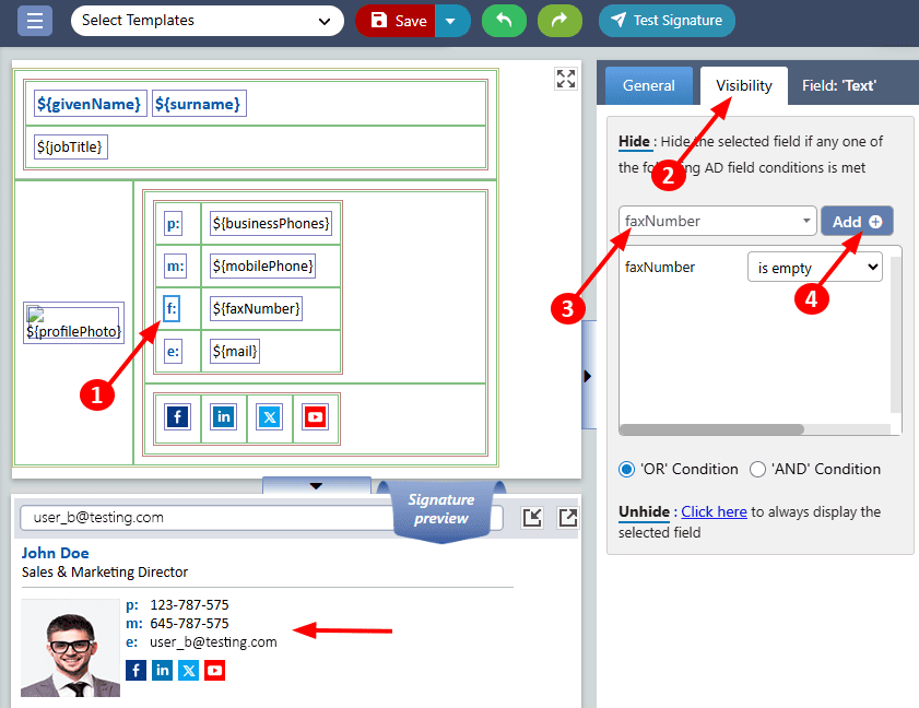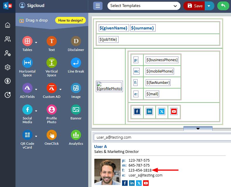 For instance: Consider that ‘User A’ has a fax number filled in his Office 365 Active Directory. The fax number field is included in the signature template.