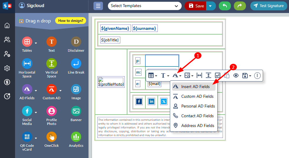 Sigsync provides Active Directory (AD) fields to include in Signature templates. This feature enables you to create unique, personalized and dynamic email signatures for each user in your organization based on Company Name, Job Title, Name, Phone Number, Address and so on. The AD placeholders are then dynamically replaced with relevant user information when the email is sent.