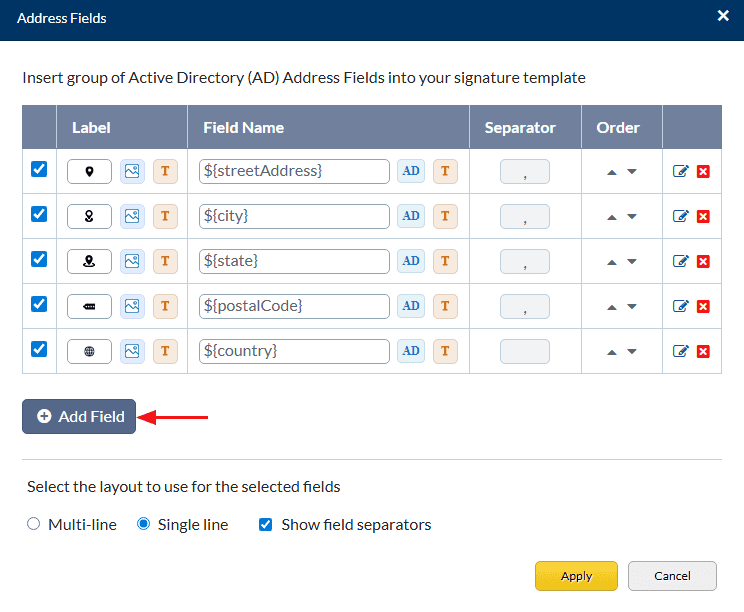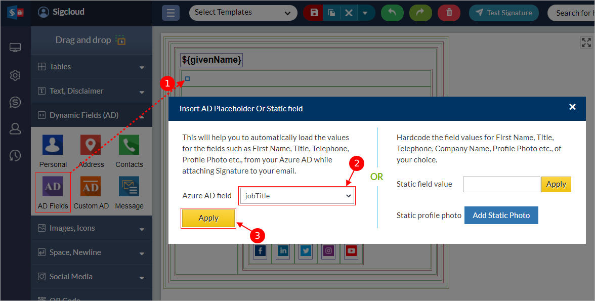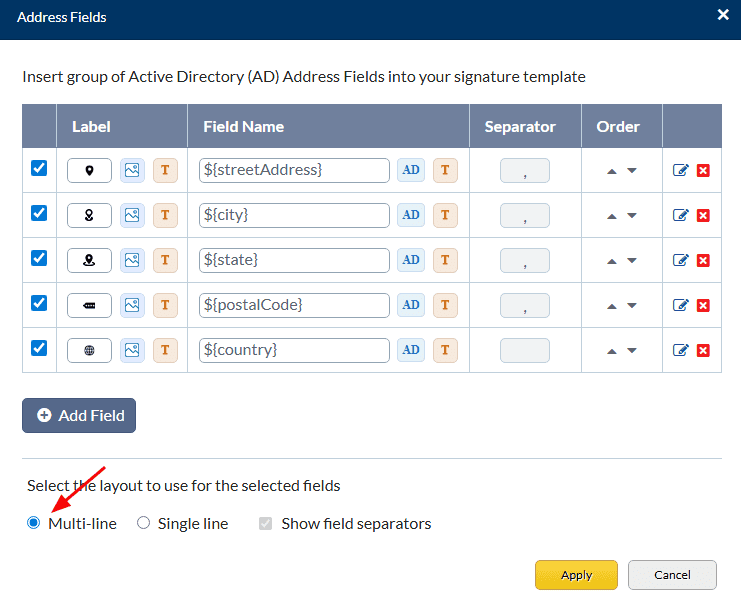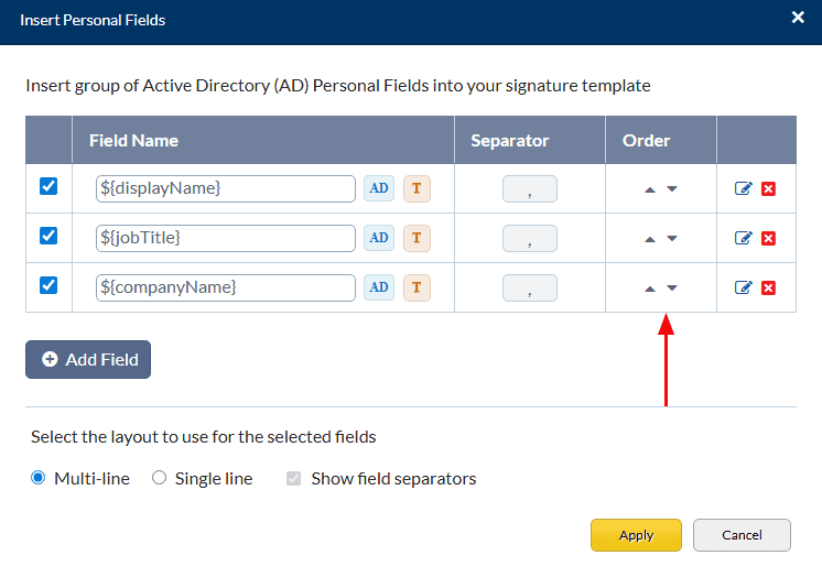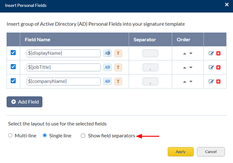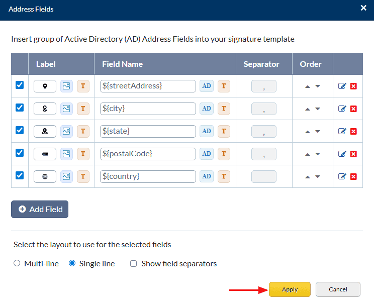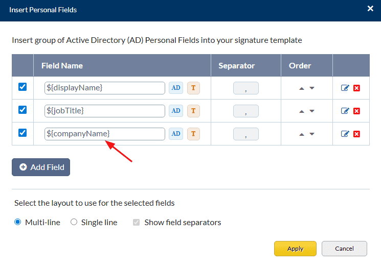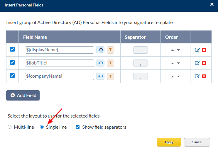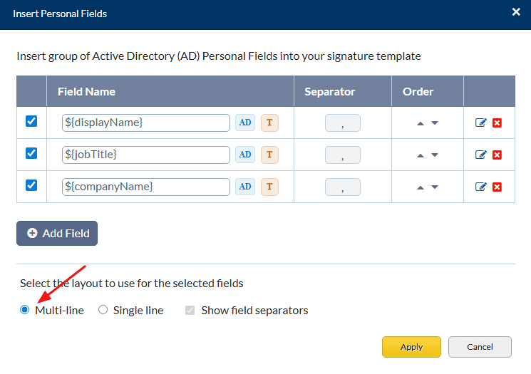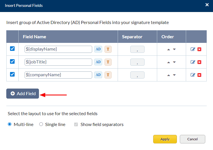 To insert an ‘Active Directory (AD)’ field in your signature template, follow the steps below.